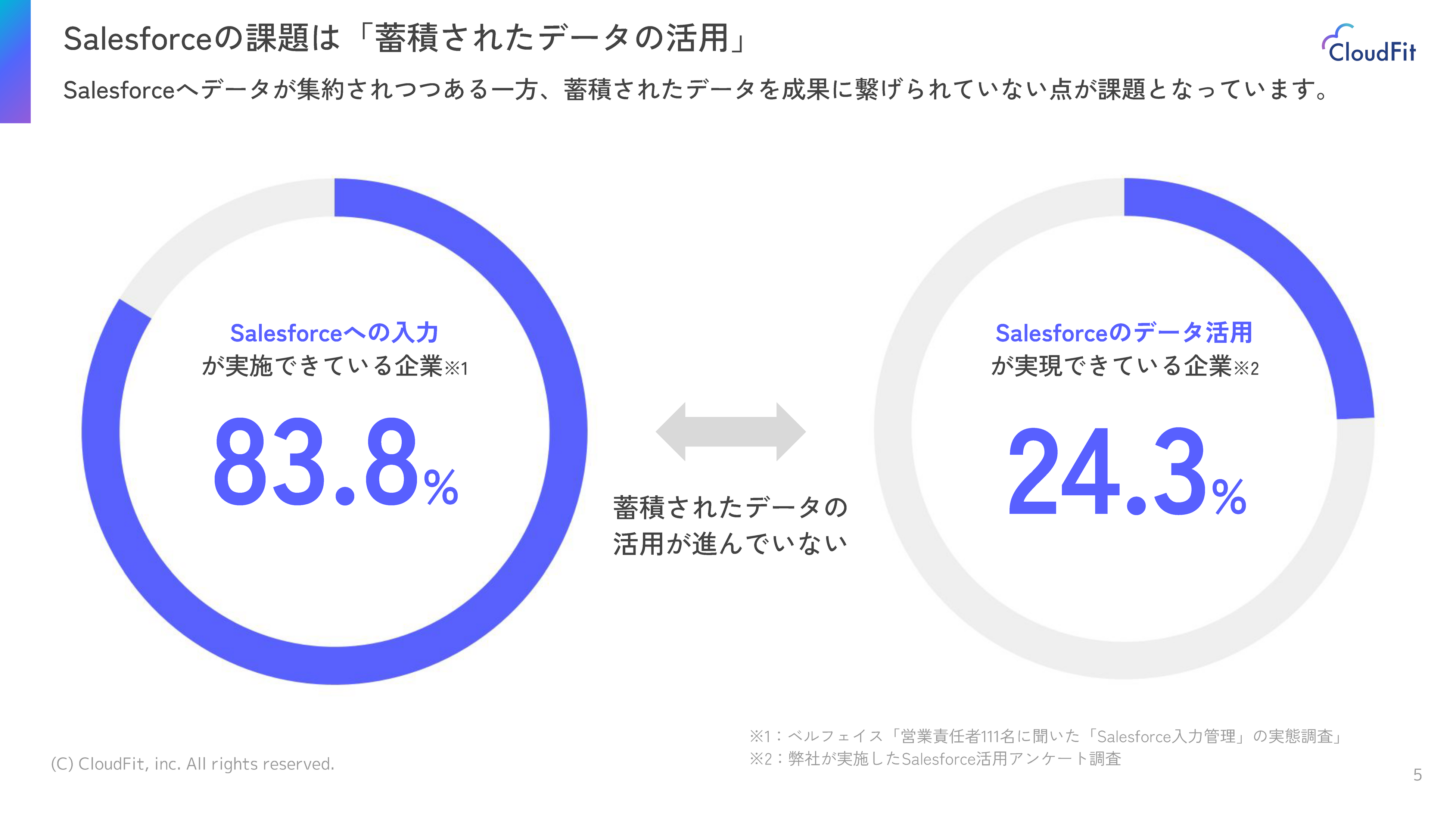 数多くの企業が導入しているSalesforceには様々なビジネスデータが集約されている一方、蓄積されたデータを成果に繋げられていない点が課題となっています。