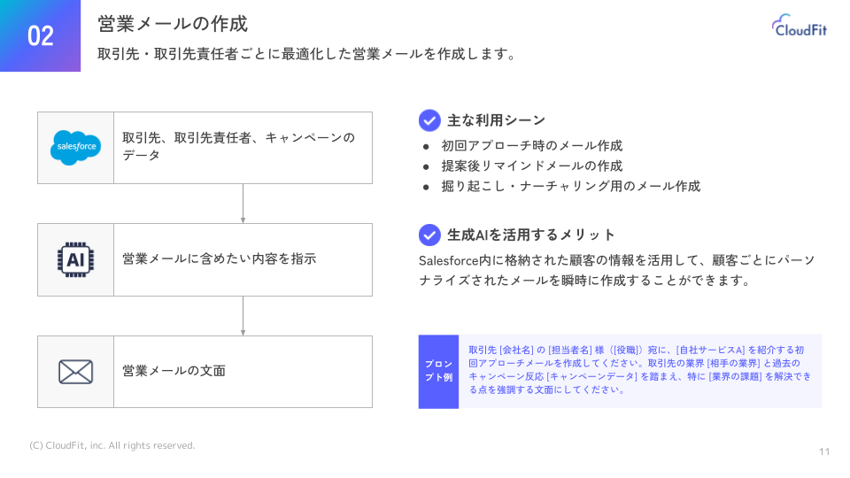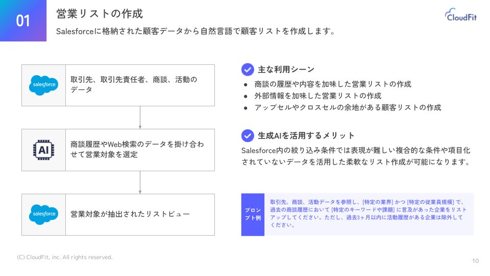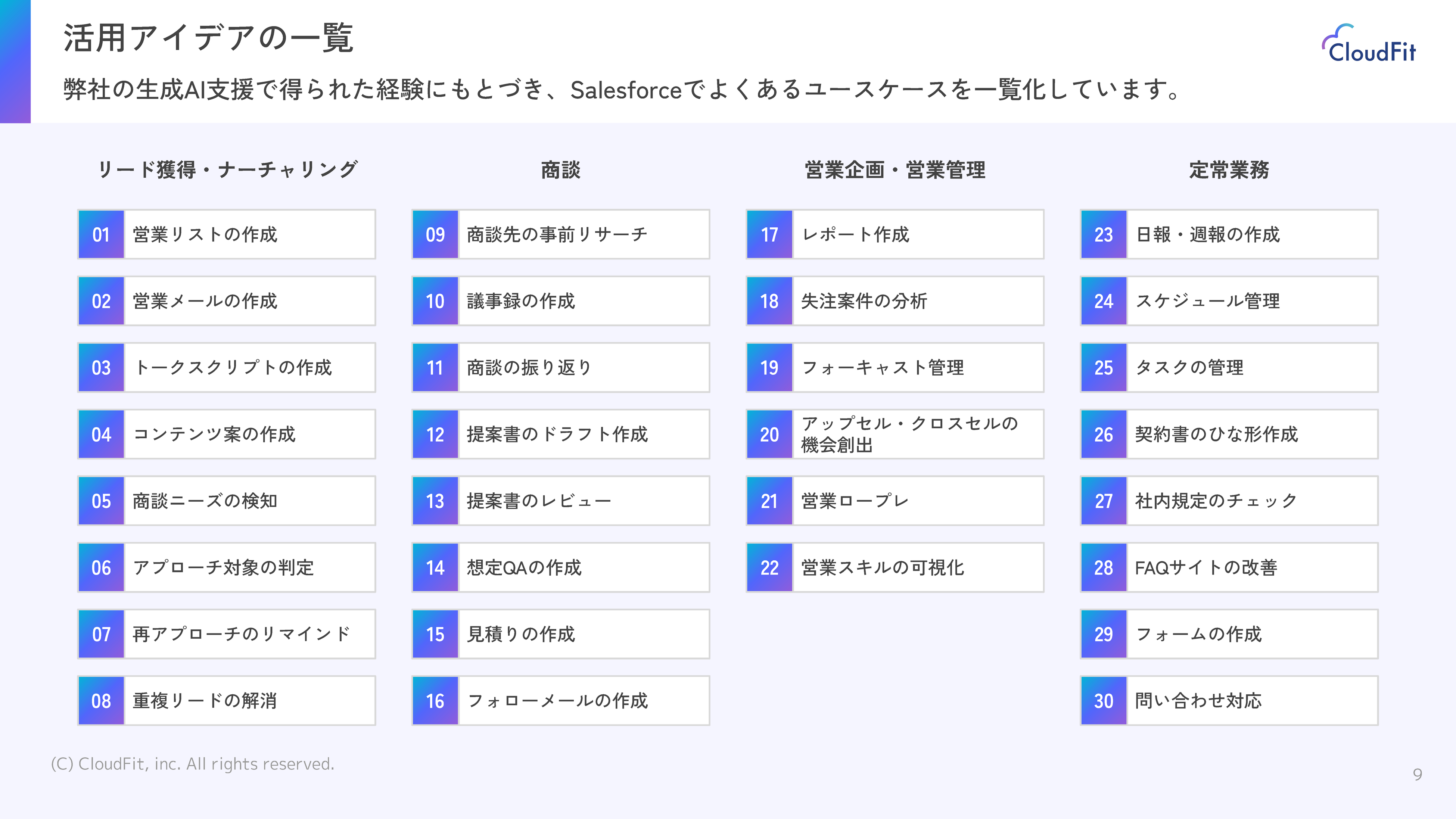 クラウドサービス・生成AIの活用によって企業のデジタル化を支援する株式会社CloudFit(本社:東京都品川区、代表取締役:瀬沼 裕樹、以下、CloudFit)は、Salesforceと生成AIの活用ユースケースをまとめた「Salesforce×生成AI活用アイデア30選」を公開しました。