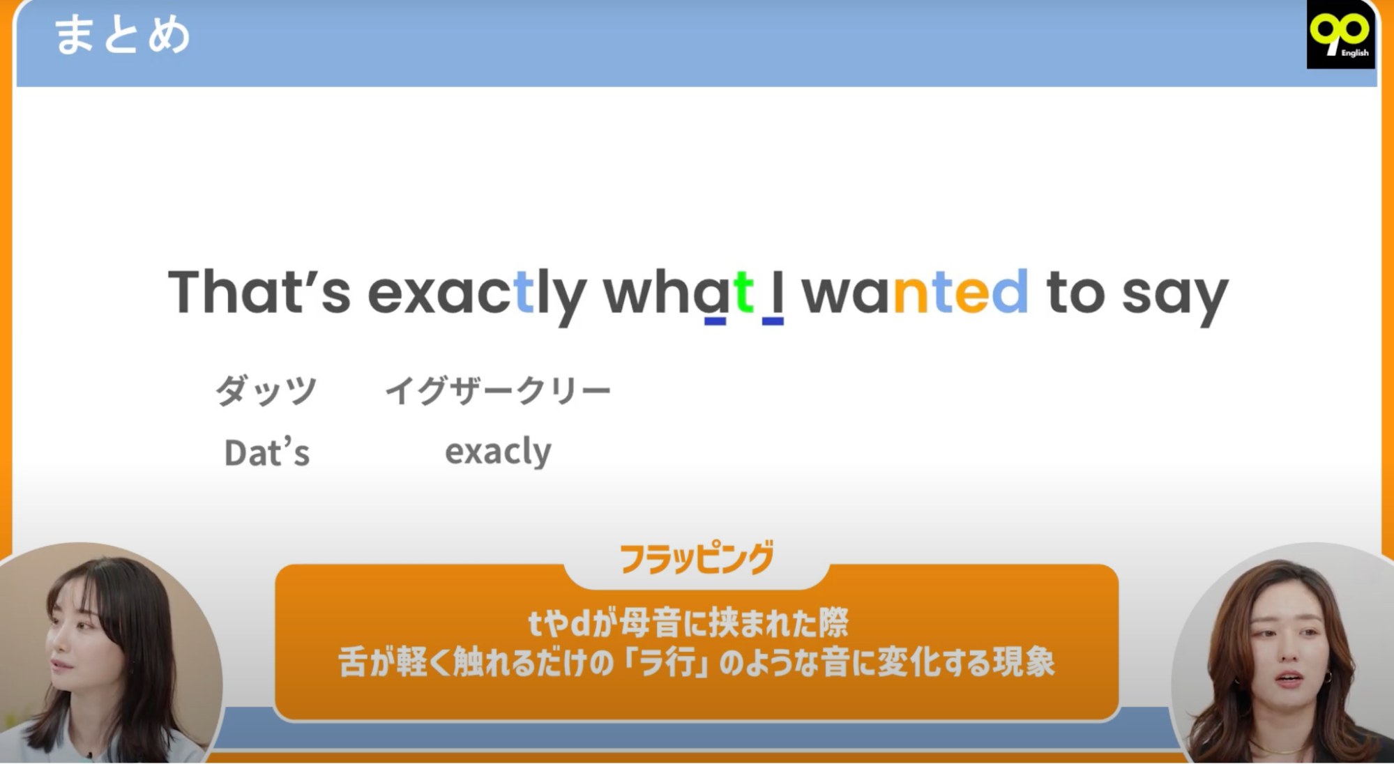 番組内では、MCの柴田阿弥さんが実際に90 Englishのレッスンを体験。言語学に基づいた「モーター性理論(発音できる音は聞き取れるようになるという理論)」を活用した指導により、"That's exactly what I wanted to say."というフレーズの発音が、わずか数分のレッスンで見違えるほど改善しました。