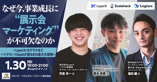 営業・マーケティング支援のリーディングカンパニーである株式会社Scalehack(本社:東京都渋谷区、代表取締役CEO:倉田丈寛、以下「Scalehack」)は、2026年1月30日(金)19時より、株式会社LayerX(本社:東京都中央区、代表取締役:福島良典、以下「LayerX」)、株式会社ログラス(本社:東京都港区、代表取締役 執行役員CEO:布川友也、以下「ログラス」)などハイグロースSaaS企業の実践事例をもとに、展示会を名刺交換で終わらせないためのROI最大化戦略を紐解くオフラインイベント「なぜ今、事業成長に“展示会マーケティング”が不可欠なのか」を開催いたします。