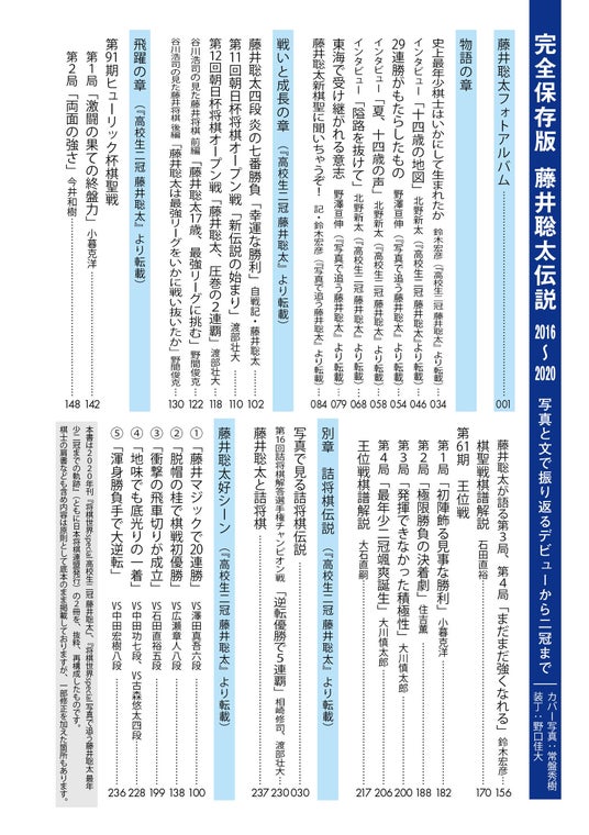 本書は、2020年9月発売の『将棋世界special 高校生二冠 藤井聡太』(ISBN:978-4-8399-7453-4)『将棋世界special 写真で追う藤井聡太 最年少二冠までの軌跡』(ISBN:978-4-8399-7454-1)を抜粋、編集、再構成したものです。