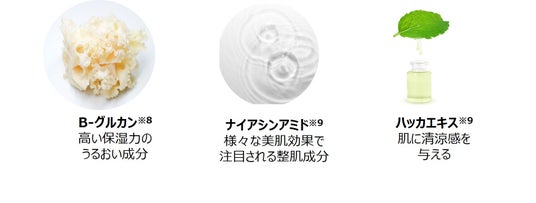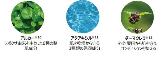 ※6カキ葉エキス、ブドウ果実エキス、コーヒー種子エキス、イタドリ根エキス、ベニバナ花エキス、サンショウ果実エキス、チャ葉エキス、クリ殻エキス(すべて整肌) ※7 整肌成分 ※8 保湿成分 ※9 整肌成分※10 ツボクサエキス、アシアチコシド、マデカッソシド、マデカシン酸、アシアチン酸、プロポリスエキス(すべて整肌) ※11 キシリチルグルコシド、キシリトール、無水キシリトール(すべて保湿)※12フナバラソウエキス(整肌)
