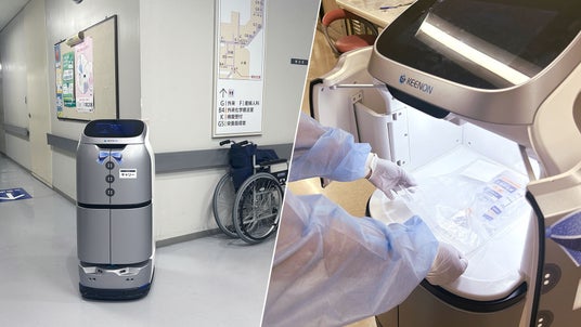 DFA Roboticsが取り扱う搬送ロボット「KEENON W3(キーノン ダブリュースリー)」は、1度に最大4箇所まで運搬が可能なロボットです。パスワードを入力すると開く扉を搭載しており、検体や薬剤など秘匿性の高い搬送にも対応しています。また、エレベーターと自動連携することで、フロアをまたいだ搬送も可能です。