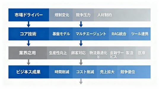 エージェント技術は単なる対話型AIの延長ではない。計画立案(Planning)、ツール連携(Tool Use)、メモリ管理(Memory)、自律実行(Autonomous Execution)を統合し、人間の監督下で業務プロセス全体を自動化・最適化する次世代アーキテクチャである。本白書は、この技術潮流を「包括的ユースケースカタログ」「実装フレームワーク群」「業界別深堀事例」の三層構造で整理し、読者が自組織のDX戦略に即座に応用できる実践知を凝縮している。
