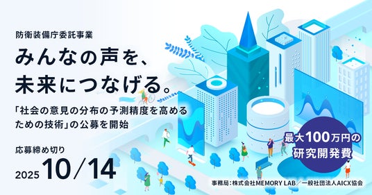 一般社団法人AICX協会(本社:東京都、代表理事:小栗 伸、小澤 健祐、以下、AICX協会)および株式会社MEMORY LAB(本社:東京都、代表:畑瀬 研斗)は、防衛装備庁 防衛イノベーション科学技術研究所の委託を受け、「社会シミュレーションプロジェクト」(以下、本事業)に関する先導研究の公募を開始いたしました。