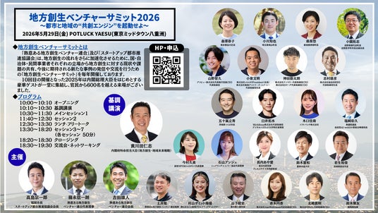 「一般社団法人 熱意ある地方創生ベンチャー連合(代表理事=篠永信一朗)」が、「スタートアップ都市推進協議会(会長=高島 宗一郎 福岡市長)」と共催で毎年開催している『地方創生ベンチャーサミット』。今年は『地方創生ベンチャーサミット2026 ~都市と地域の“共創エンジン”を起動せよ~』と題し、2026年5月29日(金)にPOTLUCK YAESU(東京ミッドタウン八重洲)にて開催いたします。