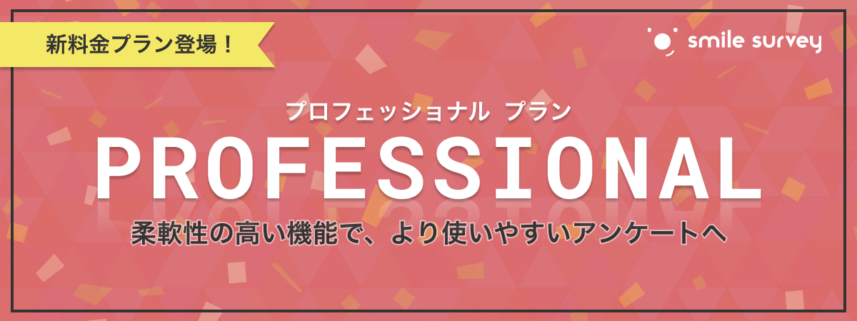 株式会社イングはセルフ型アンケートツール「smile survey (スマイルサーベイ) 」において新しい料金プランPROFESSIONAL PLAN(プロフェッショナルプラン)を2025年10月にリリースしました。この機会にぜひスマイルサーベイの導入をご検討ください。