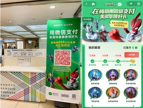 本キャンペーンでは、期間中、梅田商圏でウィーチャットを利用して、1回あたり10元人民元(約200円)以上を決済するたびに、ランダムデザインの「ウルトラマン」バーチャルバッジが1枚もらえます。バッジを一定数集めると、商圏限定のクーポンと交換できるほか、最大888元相当の利用制限なし割引クーポンやウルトラマン公式グッズが当たるチャンスもあります。