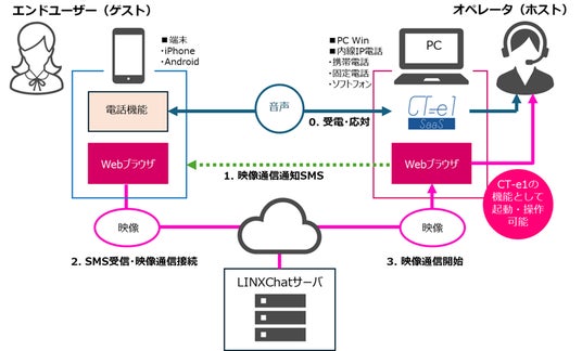 オペレーターとお客様は「CT-e1/SaaS」上で音声通話を行いながら、お客様の携帯電話番号へSMS(ショートメッセージ)で映像通信専用のURLを送信。「LINX Chat」(Webブラウザ)で映像の共有を行います。