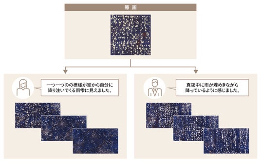 鑑賞者がアートに対して抱いたさまざまな感情や印象、心に浮かんだ世界を、原画を元に表現した動画を展示します。この展示動画は、鑑賞者がアートを見て感じた印象をデータ化し、動画生成システムを通じて制作されました。アビームコンサルティングがこれまで培ってきたデジタルテクノロジーの知見を活かし、鑑賞者の多様な感受性と原画の世界観を組み合わせた動画生成を実現しています。