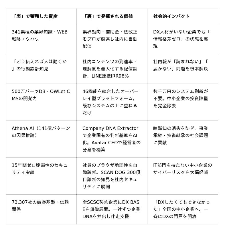 無償提供には明確な戦略的意図があります。「表のメディア」で守り続けてきた73,307社のクライアント企業を、「裏のメディア」でさらに深く支援する。企業がDX BASEに蓄積する独自ナレッジDB、AI学習済みの経営者判断基準、社員の学習履歴データ──これらは他社には模倣できない知的資産であり、「表と裏、両方を守り続けてくれるガーディアンから離れられない」という信頼構造を形成します。
