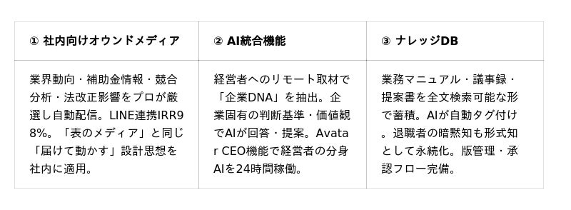 企業DNA、ナレッジDB、社員の学習履歴──使うほど精度が上がり、他社には模倣できない知的資産に。「表のメディア」が顧客を集め、「裏のメディア」が組織を強くする。この循環が、企業の持続的成長を実現します。