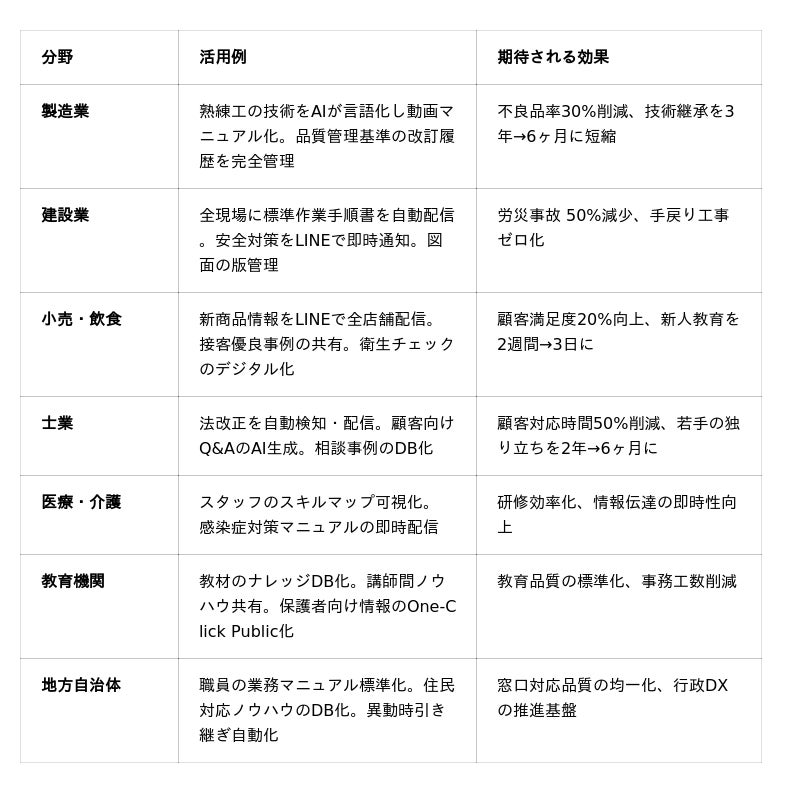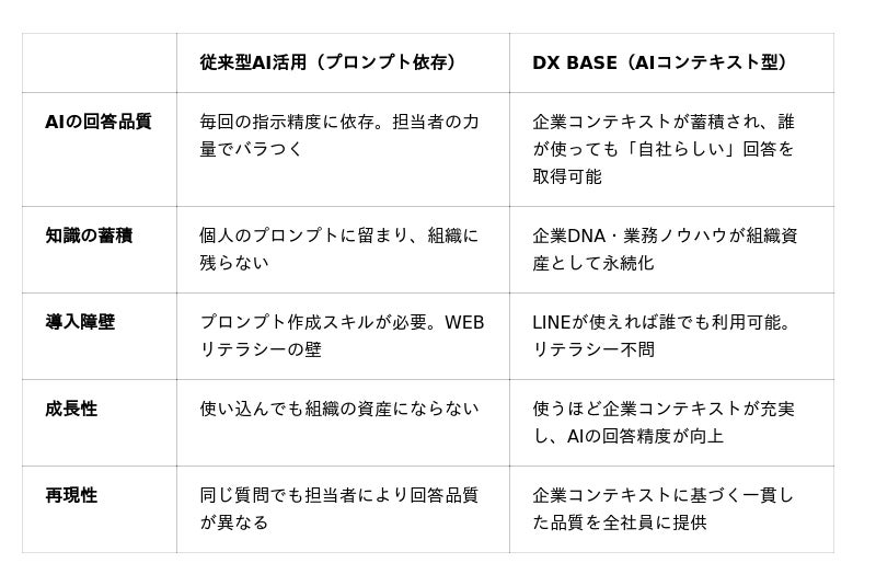 プロンプト依存ではなく、AIコンテキスト型の活用により「使う人の力量に依存しない」全社的なAI活用が実現。ChatGPTの個人利用から一歩進んだ、組織としてのAIトランスフォーメーション(AX)の基盤となります。