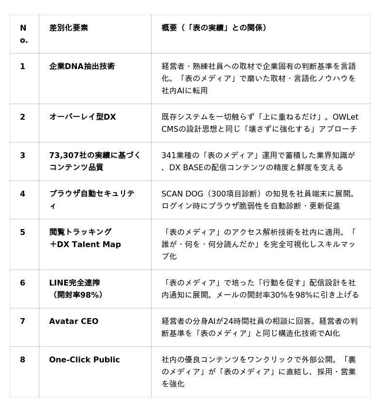「表のメディア」で顧客を動かすプロが、同じ技術と知見で社員を動かす仕組みを作る──これがDX BASEの本質であり、単なるグループウェアやSaaS型DXツールとは「次元が違う」理由です。