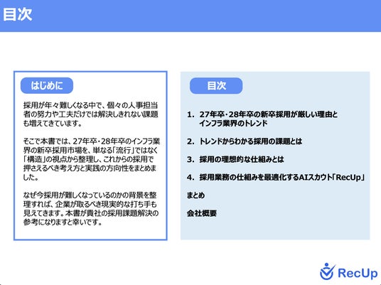 本資料では、激化するインフラ業界の新卒採用市場において、いま選ばれる企業は何が違うのか。RecUp導入企業が実践する、最新トレンドを捉えた戦略的スカウト運用の全容を公開します。
