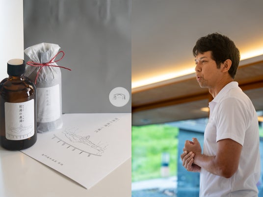 恩湯の産湯(右)と贈呈用パッケージ(左)
