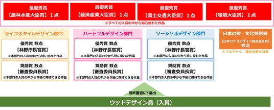 本賞では、多様な木の活用のデザインを通じて、地域活性化、持続可能な森林経営、新しいライフスタイルの提案、カーボンニュートラルへのシフト等、社会課題の解決に貢献する最も優れた作品(最優秀賞)4点に、「農林水産大臣賞」「経済産業大臣賞」「国土交通大臣賞」「環境大臣賞」が授与されることが決定しています。さらに昨年までの大阪・関西万博特別賞の流れを汲み、2025より「日本の技・文化特別賞」として、日本の木を使う技術や木の文化を、主に海外へ発信するにふさわしいプロダクツ等の作品に対して、特別賞を授与します。