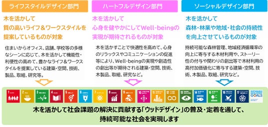 ウッドデザイン賞は、木を使って様々な社会課題を解決するモノ・コトを表彰し、国内外に発信するための顕彰制度です。今年は賞の創設以来、11年めとなります。木を使うことによって、社会課題の解決を目指す活動を「ウッドデザイン」と定義し、木の良さや価値をデザインの力で再構築することを目的として、優れた建築・空間や製品、活動や仕組み、研究等を評価・表彰する顕彰制度が、「ウッドデザイン賞」です。