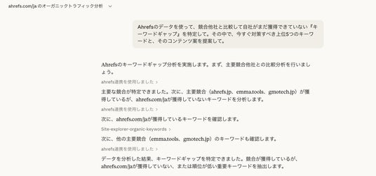 ファイルのエクスポートやアップロードは不要です。Claude に話しかけるだけで、Ahrefsの膨大なインデックスから必要な情報をリアルタイムに抽出・分析します。