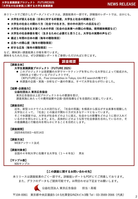 公益社団法人 東京広告協会では、このたび全国の4年制大学に在籍する大学生(男女)を対象とした『「大学生の社会参画」に関する大学生意識調査』の結果をまとめました。この調査は、東京広告協会が主催する「大学生意識調査プロジェクト FUTURE2025」が実施したもので、調査の企画・実施・分析など一連の作業をすべて大学生自らが行っています。