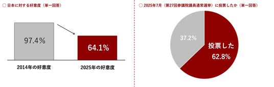 現在の大学生の日本への好意度は、2014年と比較して33.3ポイント低下。しかし、大学生の3人に2人以上が2025年7月の選挙に投票。