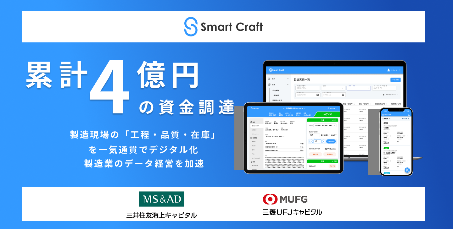 製造現場の工程管理・品質管理・在庫管理を一気通貫でデジタル化するクラウド製造実行システム「Smart Craft」を提供する株式会社Smart Craft(本社:東京都渋谷区、代表取締役:浮部史也、以下「当社」)は、2025年6月にCOOおよびCTOが就任し、経営・開発体制を強化してきました。こうした体制強化のもと、三井住友海上キャピタル株式会社、三菱UFJキャピタル株式会社を引受先とする第三者割当増資により、プレシリーズAラウンドにて総額1.8億円の資金調達を実施いたしました。本調達により、当社の累計調達額は4億円となり、プロダクトおよび事業の成長をさらに加速していきます。