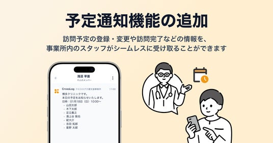 これまでCrossLogの予定通知機能は、LINE WORKSやChatworkといった外部の汎用チャットツールのみの対応でしたが、今回CrossLog Connectへの通知が可能になりました。訪問予定の登録・変更や訪問完了などの情報を、事業所内のスタッフがシームレスに受け取ることができます。変更のたびに連絡する手間を減らし、より迅速で確実な情報共有を実現します。
