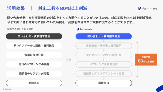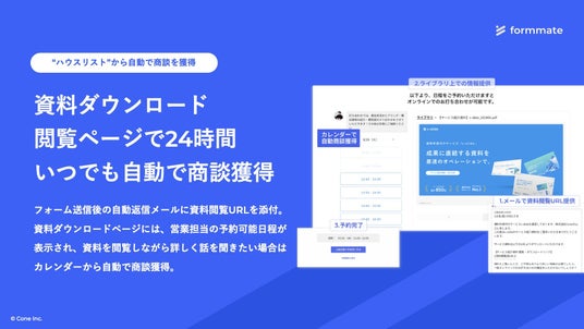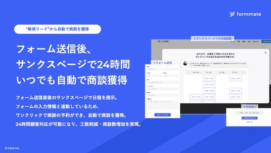 BtoB企業のコンテンツマーケティングを支援する株式会社Cone(本社:大阪府大阪市、代表取締役:佐藤 立樹、以下「当社」)は、インバウンドマーケティングでの商談創出を最大化するフォームツール「formmate(フォームメイト)」の提供を開始したことをお知らせします。formmateは、問い合わせ・資料請求発生後、サンクスページで営業担当の空き日程を表示し、自動で商談を獲得。その場で商談につながらなかった見込み顧客も、自社商材への興味度が高い見込み顧客を可視化することで商談獲得率の向上を実現します。(https://formmate.io/)