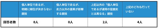 設問1で「徒競走を実施していない」と答えた人のうち、「個人単位で走るが、明確に順位が決まらない形で競技を行っている」「個人単位で走るが、走力以外の要素が影響する形で競技を行っている」と回答した人は、ともに0人でした。