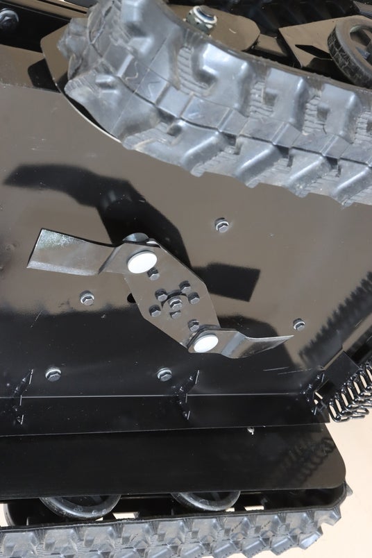 鉄パイプなどのガードではなく、全体を覆う頑丈なフレーム構造で、万一の転倒の際には衝撃から本体を守ります。草刈部は6.1馬力のエンジン、走行部は600Wブラシレスモーターを採用したハイブリッド方式。3.8km/hの速さで力強く動きます。幅が広く厚みのある2枚の刈刃(フリーナイフ)は、硬い茎もしっかりカット。過酷な環境でも、「タフカル」は素早く力強く草を刈り取ります。