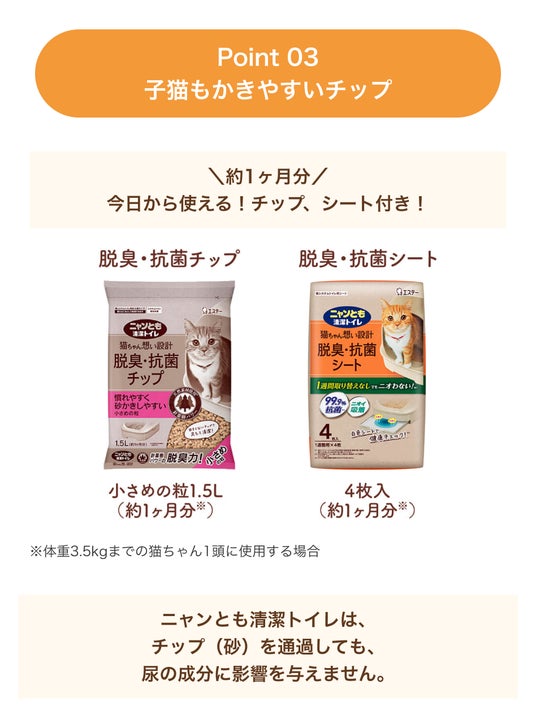※2 チップ、シートによる不快な尿臭の脱臭効果(猫ちゃん1頭に使用する場合)。ウンチをした時は早く取り除いてください
