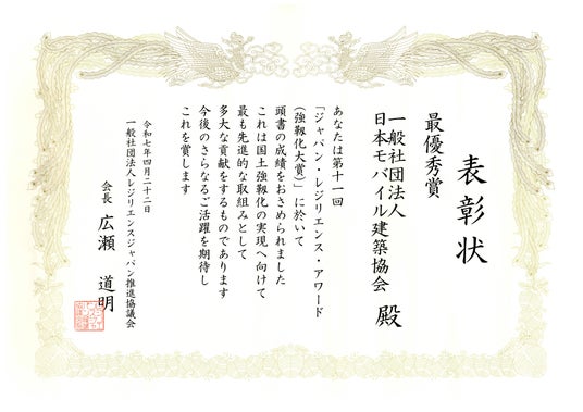 一般社団法人日本モバイル建築協会(本社:東京都千代田区、代表理事:長坂 俊成)は、一般社団法人レジリエンスジャパン推進協議会 ジャパン・レジリエンス・アワード事務局が主催する第11回「ジャパン・レジリエンス・アワード(強靱化大賞)」において、最優秀賞を受賞いたしました。
