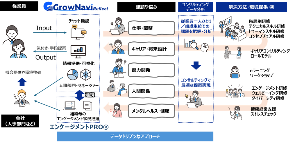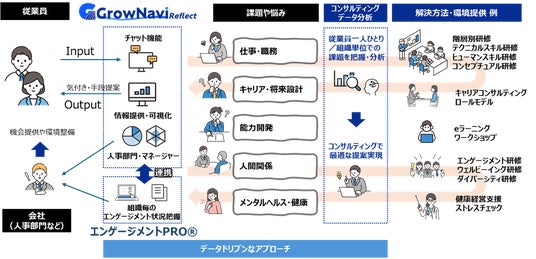さらに、『GrowNavi Reflect』の結果をもとに、個人の課題や悩みに応じた「パーソナライズ支援プログラム」の提供や、当社が展開する多様な研修・サービスとの組み合わせにより、従業員一人ひとりの成長機会を拡大し、組織全体の人材育成を総合的に支援します。