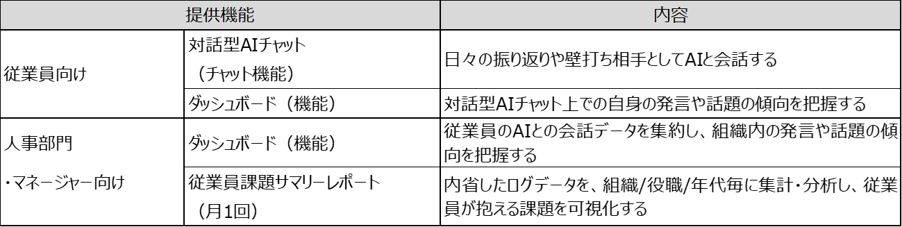 本サービスは、AIが従業員の伴走者として寄り添い、本音を引き出しながら問いかけや示唆を通じて内省を促すことで、従業員が自ら気づき、考え、行動へ移す力を育みます。さらに、その対話データを分析・可視化することで、上長(マネージャー)は部下の状況や課題を早期に把握し、的確な支援や対話につなげることができ、人事部門は組織ごとの傾向を基に人事施策を設計できます。加えて、経営層にとっては、人的資本経営の実践や人的資本開示を支えるエビデンスとして活用でき、従業員・組織・経営が一体となって成長する仕組みを実現します。