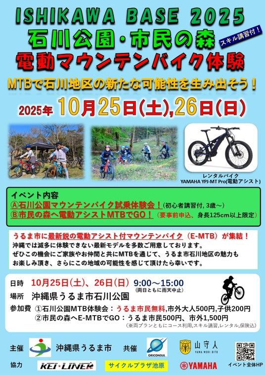 沖縄県中部のうるま市(人口12万人)の北部、石川地区の市街地にある石川公園、そして石川地区北部の山間部に位置する市民の森の新たな活用検討を目的として、マウンテンバイク(以下MTB)体験会を10月25日(土)、10月26日(日)に開催し約100名が参加しました。