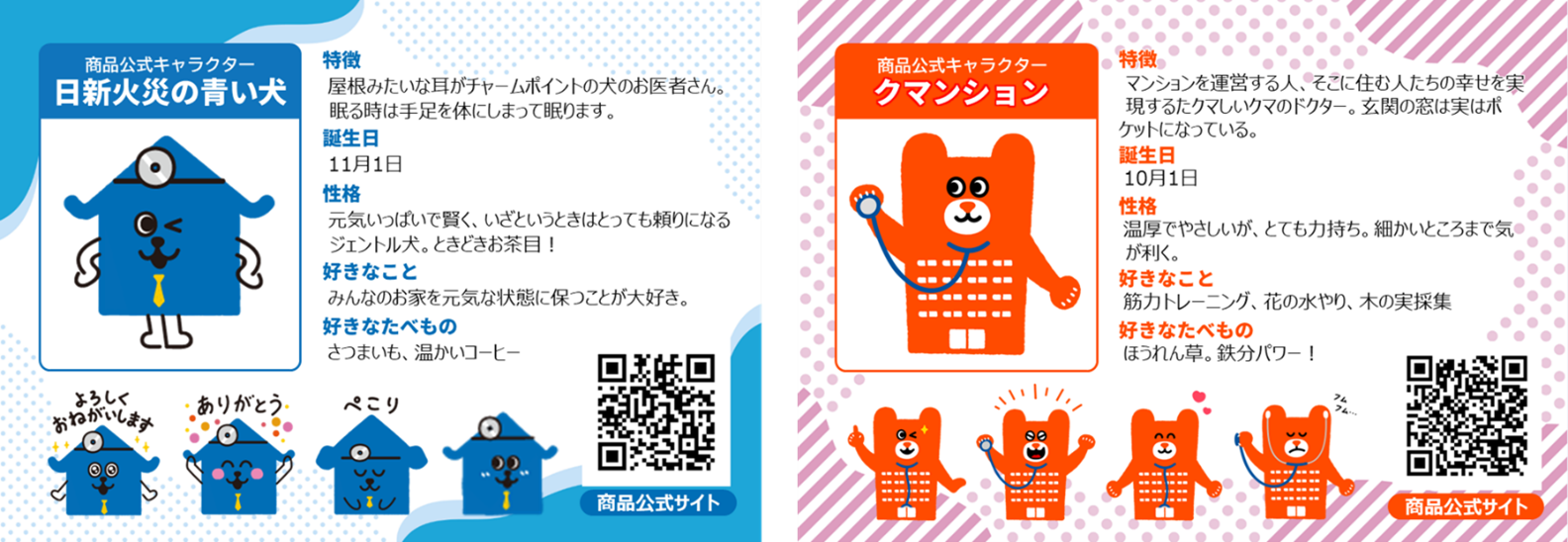 日新火災の商品公式キャラクター「日新火災の青い犬」と「クマンション」のプロフィールをご紹介します。