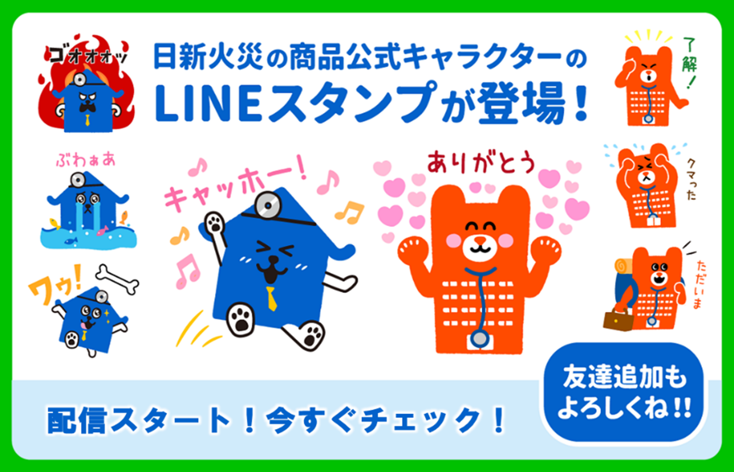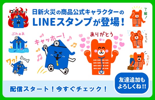 日新火災海上保険株式会社(本社:東京都千代田区、取締役社長:織山 晋、以下「日新火災」)は、商品公式キャラクターである、「日新火災の青い犬」と「クマンション」のLINEスタンプ配信を開始したことをお知らせいたします。