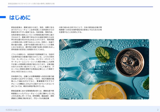 Lively合同会社(本社:東京都千代田区、Founder & CEO:種田 毅、Co-Founder & Co-CEO:三浦 友見)は、サステナブルな未来に向けたビジョンと先見力を育むことを目的としたレポート・シリーズ、第8回となるレポート「飲食品産業のサステナビリティの取り組み事例と戦略的示唆」を、Livelyの公式Webサイトにて公開しました。