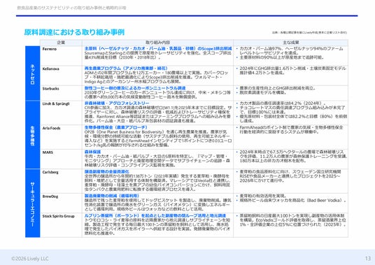 本レポートでは、飲食品産業において、環境負荷と事業リスクが集中するバリューチェーン上流(研究開発・製品設計・原料調達)に焦点を当て、グローバル先進企業27社の取り組みを分析しました。