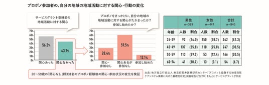 そうした中で、プロボノは現役世代が参加しやすいボランティアのかたちとして注目されています。さらに、プロボノに参加した人に対して行ったアンケートからは、活動の前後で、地域活動に関心がなかった層のうち約6割が関心を高め、1割以上が実際に自分の地域で活動を始めたという結果が得られており、「プロボノ」が地域と接点を持つきっかけとなることが分かっています。