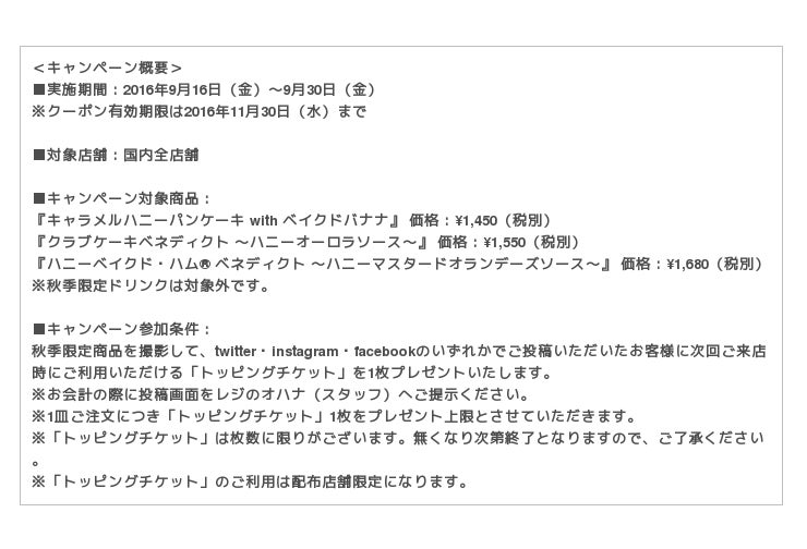 本キャンペーンは、秋季限定の「キャラメル&ハニー」をコンセプトしたパンケーキとエッグスベネディクトの発売を記念し、ご注文後に本商品を撮影・SNSにご投稿していただくと、次回来店時にパンケーキやオムレツでお試しいただける「トッピングチケット」をプレゼントいたします。
