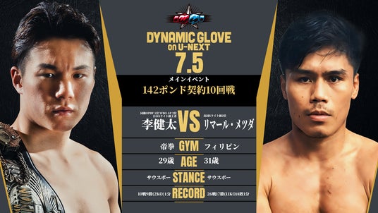 第34回DYNAMIC GLOVE on U-NEXTのメインイベントを任された日本スーパーライト級王者の李健太(帝拳)が「3冠」を見据えた重要な一戦を迎える。サウスポー対決となるリマール・メツダ(フィリピン)との142ポンド契約10回戦は、アジア2冠王者との対決を想定した「前哨戦」といっていい。現在、李は東洋太平洋とWBOアジア・パシフィックのランキングで1位に入る。両王座で指名挑戦者の立場にあるだけに「それを念頭に置いておきたい」と気を引き締める。両王座を保持するのは今年6月に永田大士(三迫)に判定勝利したキム ジュヨン(韓国)だ。年内に組まれそうなキム戦を意識しつつ、李は「その前に何か心の中で引っ掛かるものを取りたい」とメツダ戦を見据えている。
