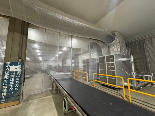 <施設内部の様子>正面左中央:間仕切りカーテン、正面右奥の機械:エアーハンドリングユニット