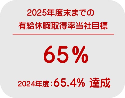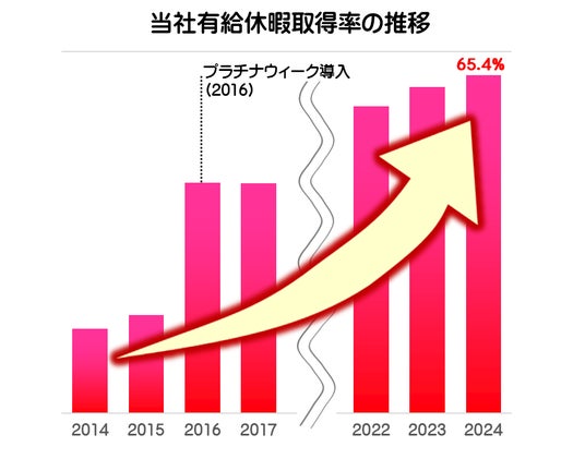 プラチナウィークは、所定休日と併せて取得することで、連続5日間以上の休暇取得が可能です。2016年の導入から9年が経ち、2024年度の当社の有給取得率は65.4%と、全国平均の65.3%※(不動産・物品賃貸業は62.4%※)を上回るとともに、2023年に当社が定めた「2025年度末までの有給休暇取得率65%」という目標を、早期に達成することもできました。