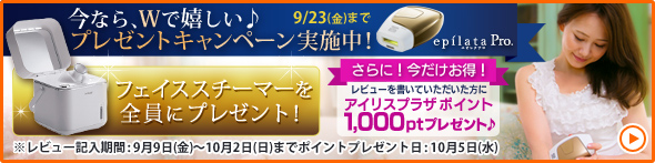 アイリスオーヤマ株式会社(本社:仙台市、代表取締役社長:大山 健太郎)のグループ企業である株式会社アイリスプラザ(宮城県仙台市青葉区中央2丁目1-7 アイリス青葉ビル TEL:0120-323-410)では、新商品の手軽にホームエステができる、家庭用光脱毛器「エピレタプロ EP-0230-N」期間中ご購入者様対象に「フェイススチーマーをもれなく全員にプレゼントキャンペーン」を2016年9月9日(金)10:00AM ~2016年9月23日(金)10:00AM まで実施しております。さらに、期間中「エピレタプロ EP-0230-N」のレビューを書いていただいた方に、アイリスプラザポイント1,000ptプレゼントいたします。2つの嬉しいプレゼントキャンペーンをぜひお見逃しなく。
