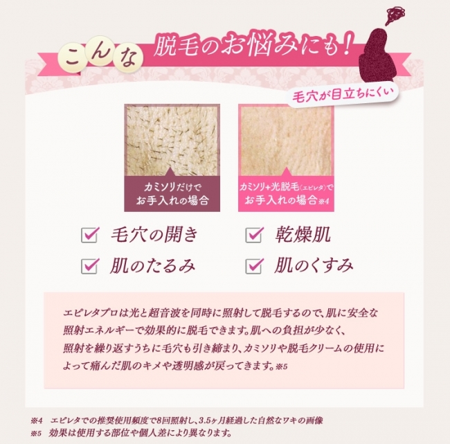 「毛穴の開き」「乾燥肌」「肌のたるみ」「肌のくすみ」など脱毛の悩みに、家庭用光脱毛器「エピレタプロ EP-0230-N」は応えます。家庭用光脱毛器「エピレタプロ EP-0230-N」は光と超音波を同時に照射して脱毛するので、肌に安全な照射エネルギーで効果的に脱毛できます。肌への負担が少なく、照射を繰り返すうちに毛穴も引き締まり、カミソリや脱毛クリームの使用によって痛んだ肌のキメや透明感が戻ってきます。(※1)