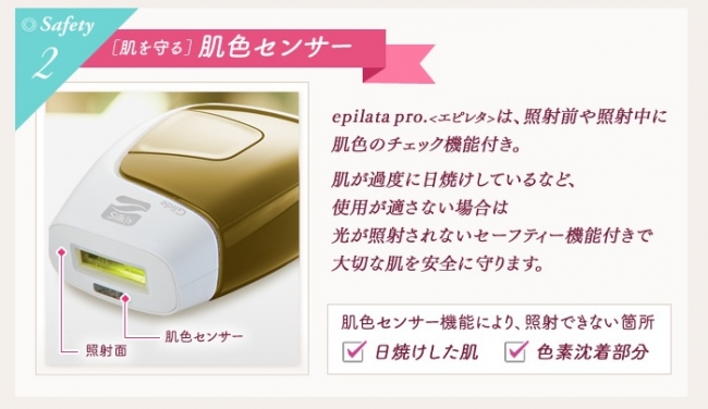 家庭用光脱毛器「エピレタプロ EP-0230-N」は、照射前や照射中にお肌のチェック機能付きです。肌が過度に日焼けしているなど、使用が適さない場合は、光が照射されないセーフティー機能付きで大切なお肌を安全に守ります。