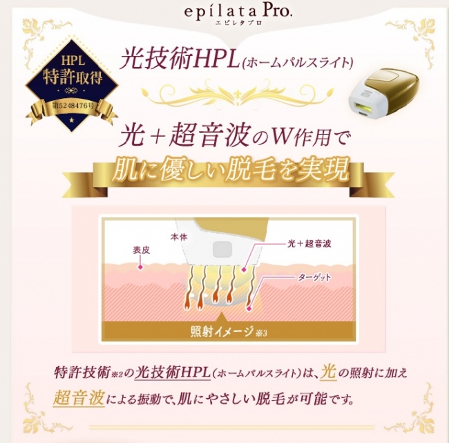特許技術の光技術HPL(ホームパルスライト)は、光の照射に加え、超音波による振動で、肌にやさしい脱毛を可能にしました。「エステを予約してその都度サロンに通うのが大変…。」「エステは高額だし、もっと手軽に脱毛したい」というお客様の声にお応えし、エステと同じ効果をお家でいつでも体感できる、家庭用光脱毛器「エピレタプロ EP-0230-N」を発売しました。