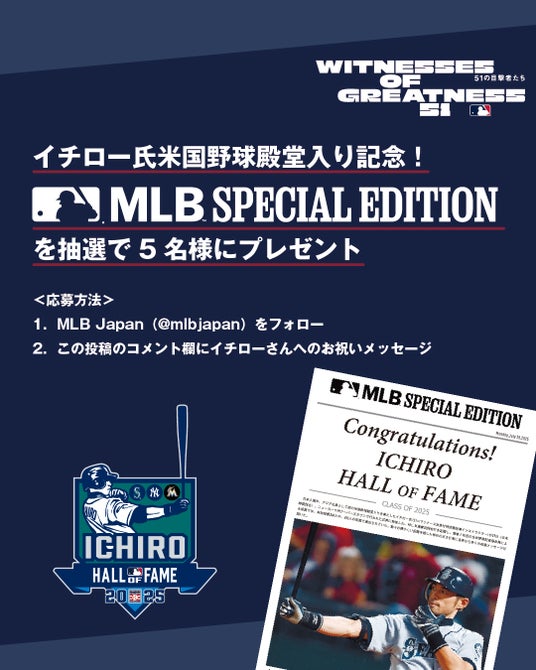 7月28日当日に東京・愛知・兵庫で配布するイチロー氏のMLB時代の功績と豪華著名人からの祝福メッセージを掲載した『MLBTM SPECIAL EDITION』を抽選で合計10名様にプレゼントするSNSキャンペーンをMLB Japan公式Instagram(@mlbjapan)、X(@MLBJapan)にて実施いたします。