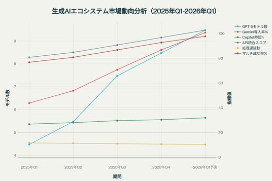 ChatGPT-5は8つのモデルバリエーション(Base、Large、XL、Ultra、Edge、Pro、Enterprise、Medium)を展開し、用途別最適化と価格帯の多様化を実現している。Google Geminiは2.5世代のFlash/Pro系統とRobotics-ERによる実世界応用を加速し、マルチモーダル処理とリアルタイム統合に優位性を示す。Microsoft 365 Copilotは既存のエンタープライズエコシステムとの深度統合により、業務効率化とROI実証において先行している。